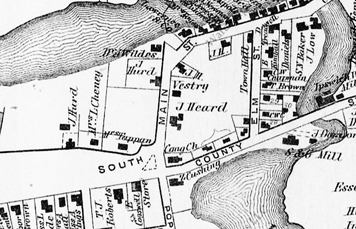 The first meeting house of the South Parish was constructed in 1838 and stood at approximately the location of the memorial in the roadway where South Main Street meets County Rd. The congregation built a new meeting house, and the older structure was taken down. Thomas Franklin Waters wrote a history of the South Church and the vestry building in Volume II, Ipswich in the Massachusetts Bay Colony: