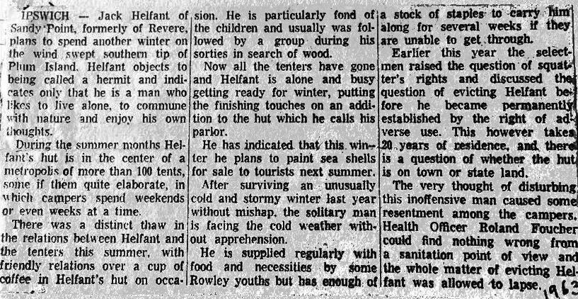 Jack Helfant, 49, of 123 Addison st., Chelsea, the former “Hermit of Plum Island,” died Monday at his home. Helfant resided in a makeshift shack of driftwood and debris on the Ipswich end of the island from June 1962 until he was evicted by the government in 1966. The ex-Army career man arrived at Rowley Wharf, Rowley, in 1962, in the first of a fleet of three cabs loaded with boxes, battered suitcases, yards of used canvas and tarpaulin, pots, pans, nails, boards and firearms. Half his equipment was lost when a makeshift raft, used to carry the load along the Plum Island River, floundered and his tired rowboat began to sink.