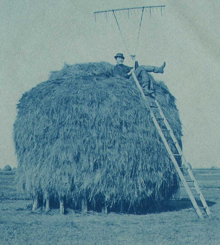 Farmhand atop a salt marsh haystack at Plum Island