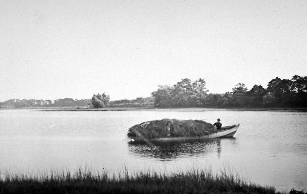 “On the more distant Plum Island marshes, the green salt hay was loaded into great gundalows which were rowed slowly with huge oars with a favoring tide to some convenient dock where it was unloaded and loaded upon the farm wagons. Every old-time farmer owned his marsh lots and esteemed them a valuable asset. The long coarse reedy grass borne by the thatch banks, which are submerged by every tide, was of less value but was reckoned worth getting for bedding and banking about the buildings and covering.”