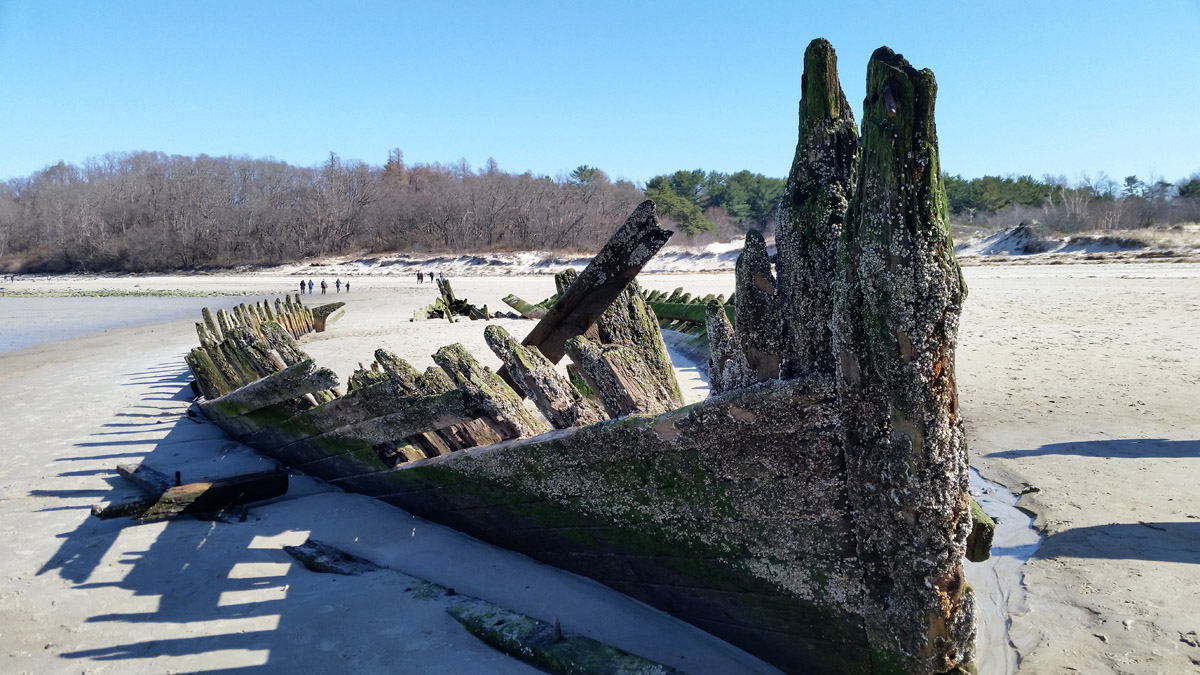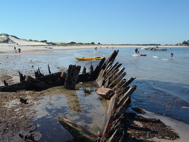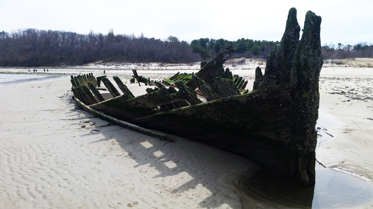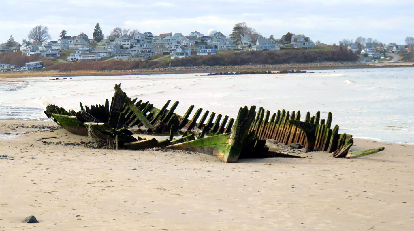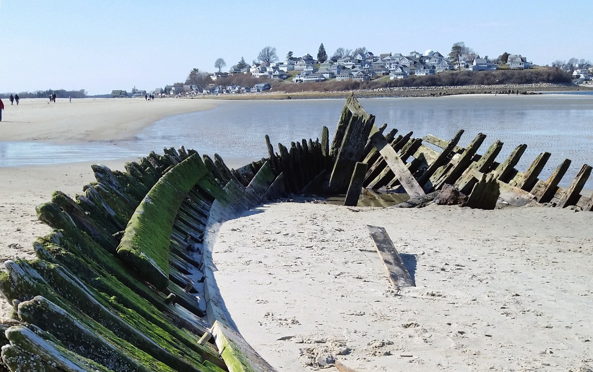 On December 28th, Capt. Brewster again declined assistance and told the station crew that he was going to sell the vessel to wreckers. On Jan. 2, he informed the lighthouse keeper that he could find no one to buy the wreck. On the following day the life-saving crew arrived to assist him in stripping the ship, and the vessel was a total loss. The unfortunate elderly captain returned to Maine penniless, seeking farm employment. The marooned ship became an instant attraction, but less than a year later she was buried to the deck. After a year only upper sections of the frame were visible. The ship had not moved since it is well-anchored in the sand, and in the skeleton of the ship can often be seen offshore at very low tides. The sands of Crane Beach are slowly moving toward the mainland.