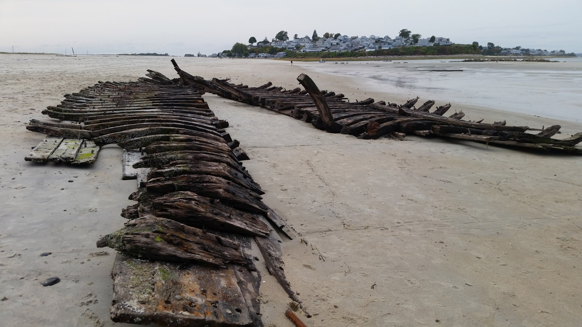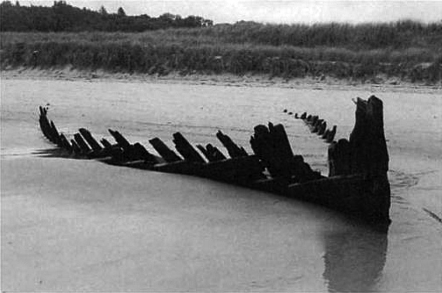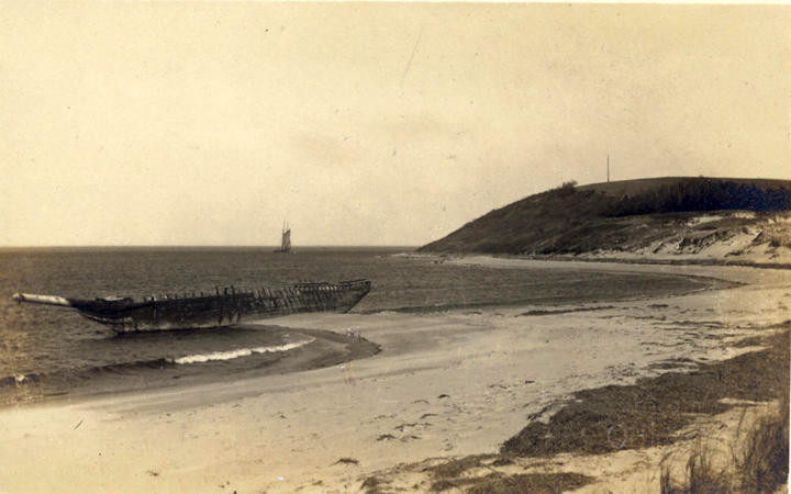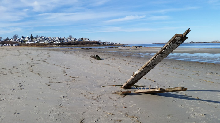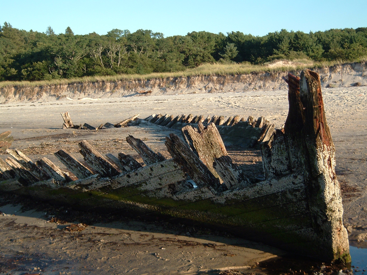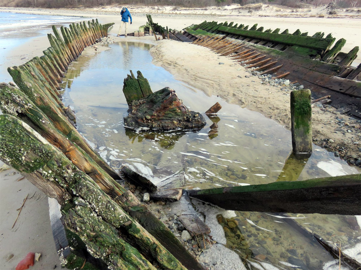 On December 28th, Capt. Brewster again declined assistance and told the station crew that he was going to sell the vessel to wreckers. On Jan. 2, he informed the lighthouse keeper that he could find no one to buy the wreck. On the following day the life-saving crew arrived to assist him in stripping the ship, and the vessel was a total loss. The unfortunate elderly captain returned to Maine penniless, seeking farm employment. The marooned ship became an instant attraction, but less than a year later she was buried to the deck. After a year only upper sections of the frame were visible. The ship had not moved since it is well-anchored in the sand, and in the skeleton of the ship can often be seen offshore at very low tides. The sands of Crane Beach are slowly moving toward the mainland.
