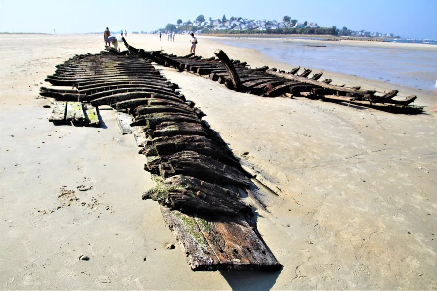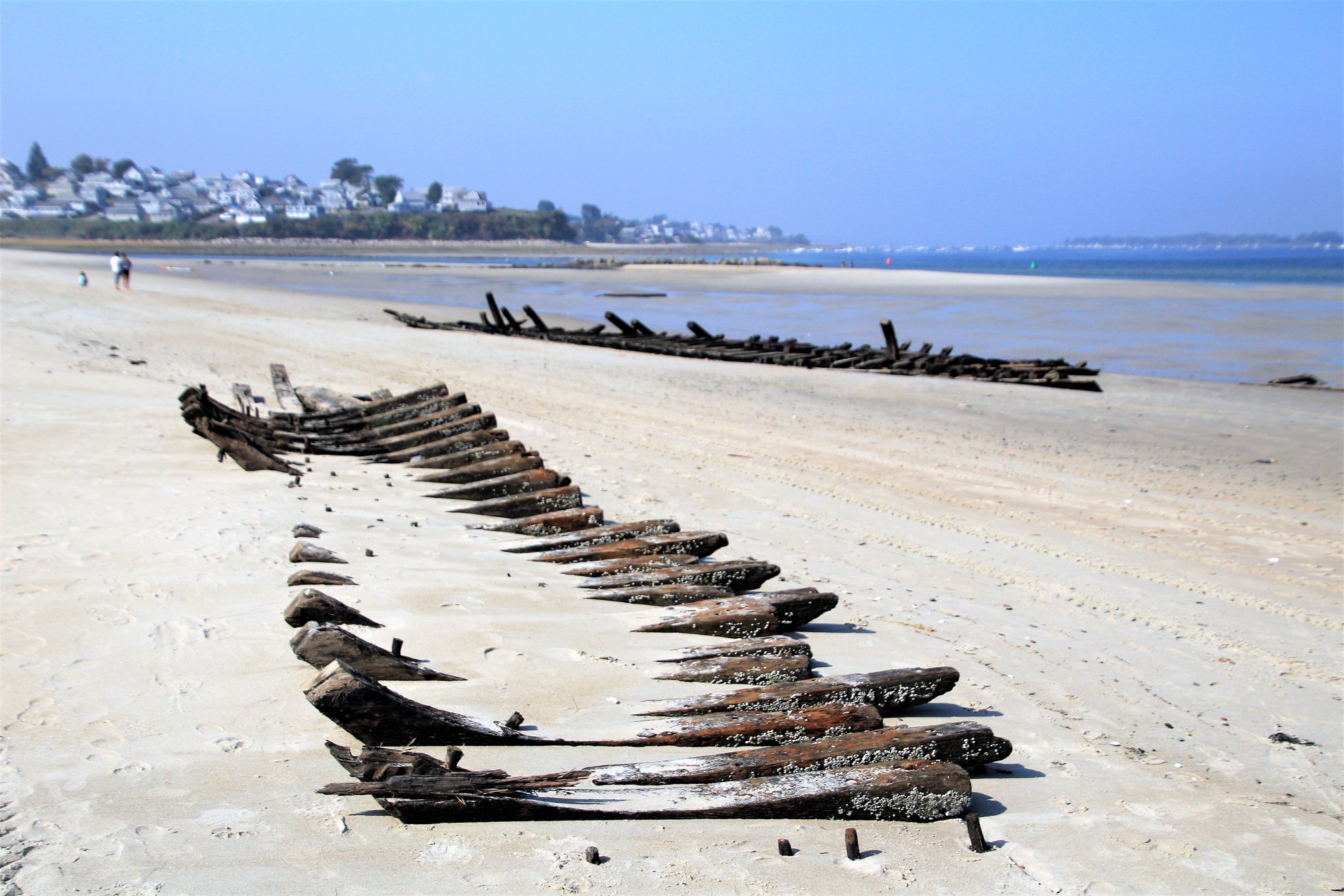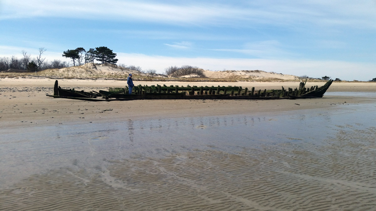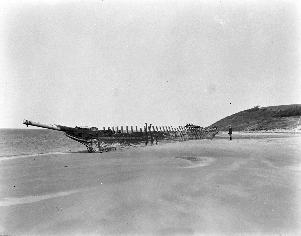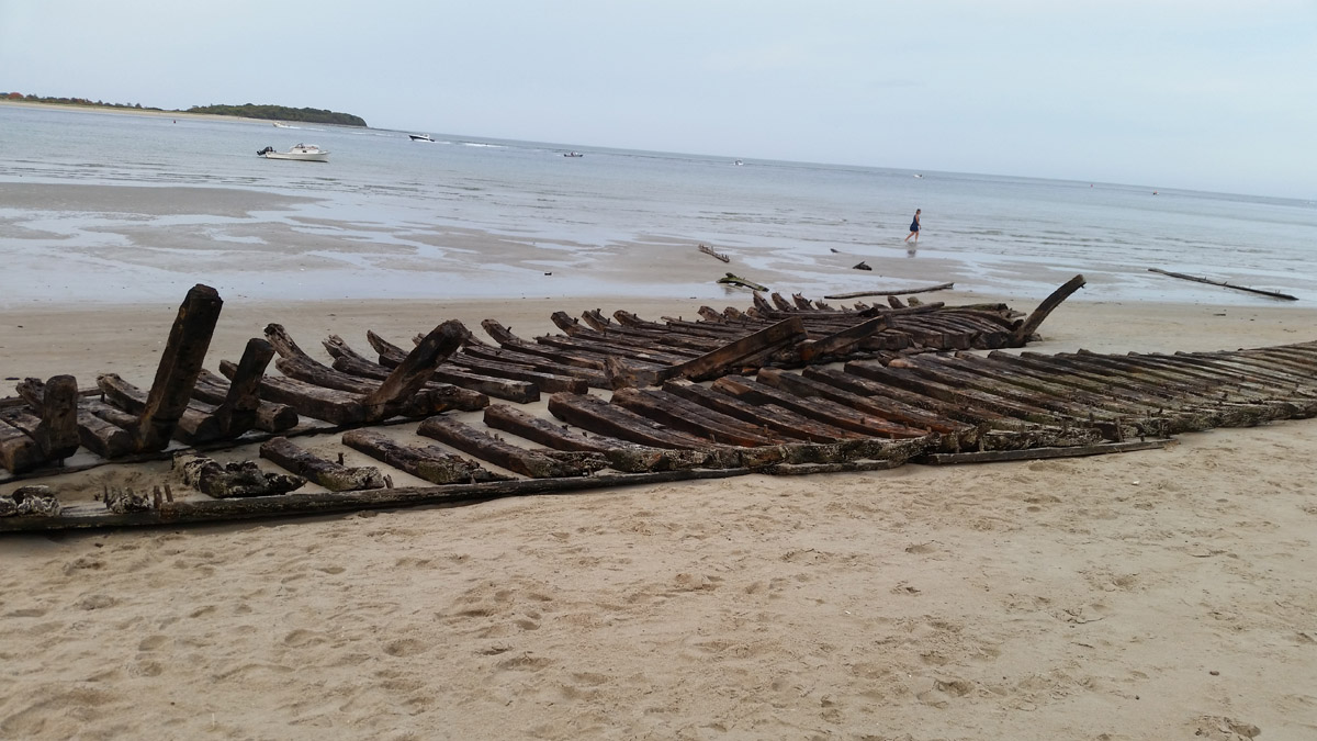 On December 28th, Capt. Brewster again declined assistance and told the station crew that he was going to sell the vessel to wreckers. On Jan. 2, he informed the lighthouse keeper that he could find no one to buy the wreck. On the following day the life-saving crew arrived to assist him in stripping the ship, and the vessel was a total loss. The unfortunate elderly captain returned to Maine penniless, seeking farm employment. The marooned ship became an instant attraction, but less than a year later she was buried to the deck. After a year only upper sections of the frame were visible. The ship had not moved since it is well-anchored in the sand, and in the skeleton of the ship can often be seen offshore at very low tides. The sands of Crane Beach are slowly moving toward the mainland.