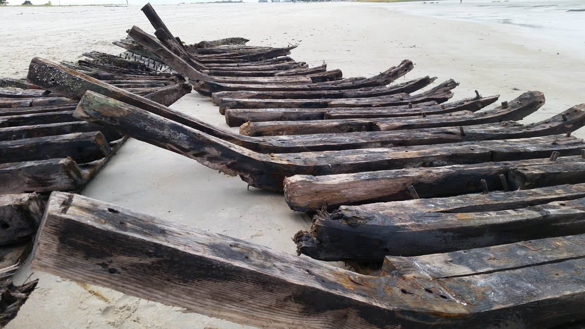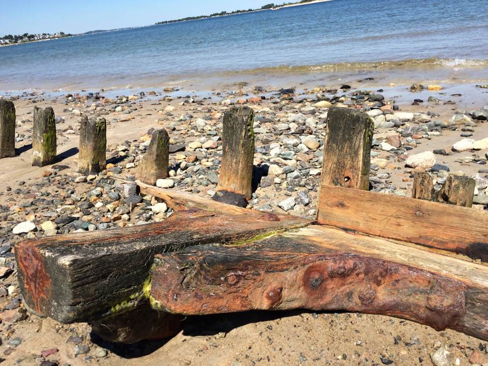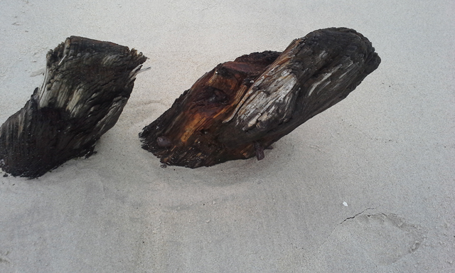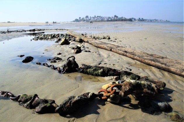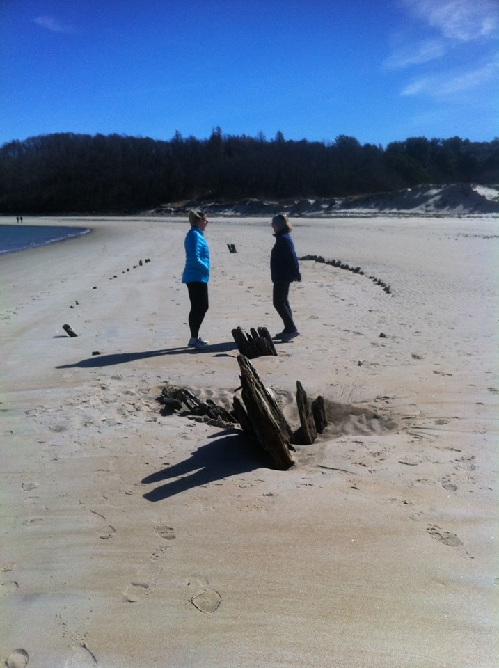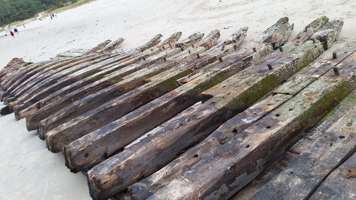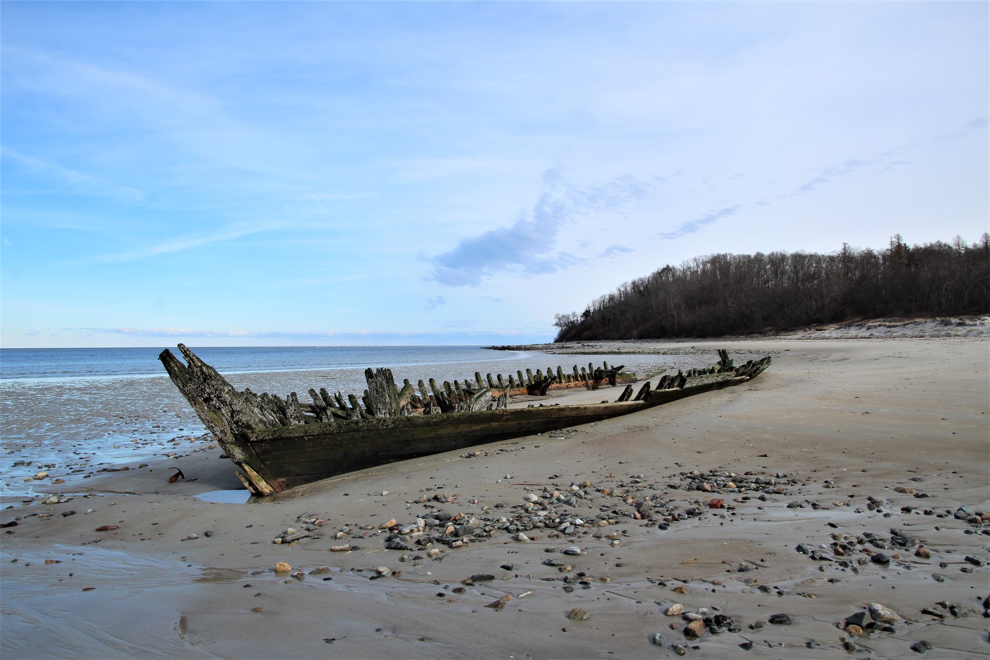 The stern or bow of another ship, possibly the Edward S. Evelyth, lies nearby at the water’s edge, covered with green moss. Once at very low tide, I was able to wade into the water and observe the faint outline of a ship’s skeleton.