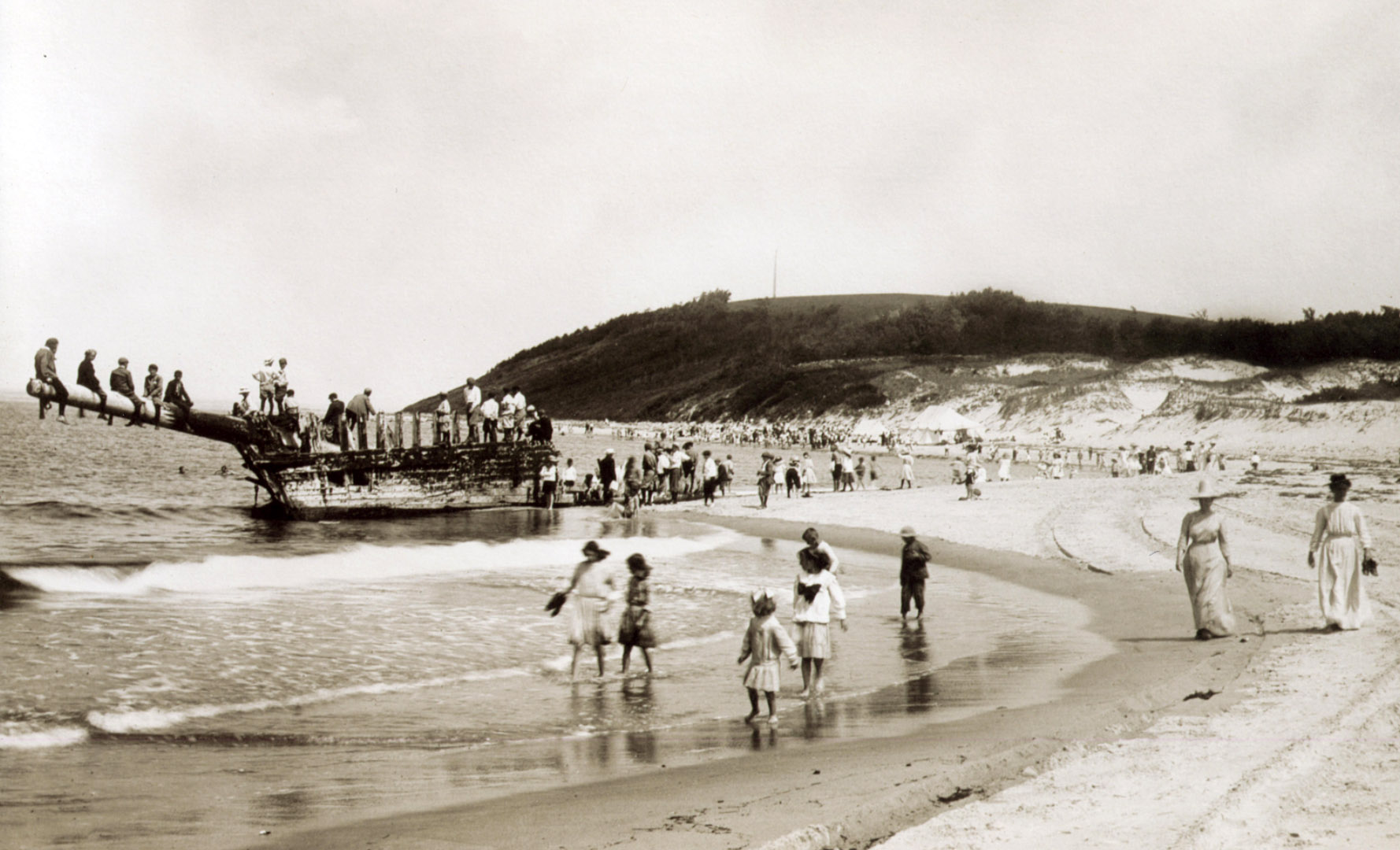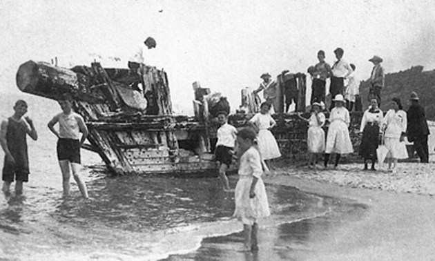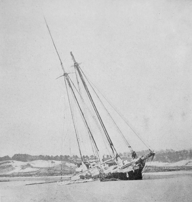 Christmas, 1909 witnessed the heaviest storm in many years and is known by sailors on the Atlantic Coast as one of the most fateful days in the history of these waters. The “Great Christmas Snowstorm” struck the North Atlantic States hard as far south as Maryland. Philadelphia had 21 inches in 23 hours. The storm did its greatest damage in New England, where winds gusted to 72 mph in Rhode Island. The gale assumed terrific force on Christmas night and continued well into the following day. The list of shipwrecks and deaths was said to be as long as the Coast itself. Photo from the Trustees of Reservations archives. The First Annual Crane Beach picnic was held at the site of the wrecked Ada K. Damon Capt. A. K. Brewster had sold his farm in York, Maine and invested everything in the sand schooner Ada K. Damon. The Ada K. Damon was a two-mast schooner built in 1875 at H. A. Burnham Boat Building in Essex, Massachusetts. She was 84 ft long and had a beam of 23.3 ft and a depth of 8.2 ft.