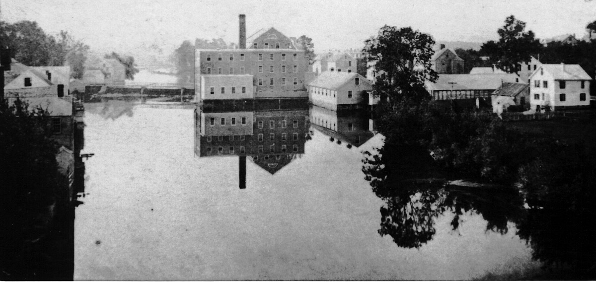 “It was not until 1827 that we know of a substantial stone dam built at today’s location. It was built for the Ipswich Manufacturing Company, consisting of Joseph Farley and brothers George and Augustine Heard to power a stone textile mill that would be located on the north side of the river and would manufacture cotton cloth. This was the first time water power had ever been used in Ipswich to produce cloth. At this time the ancient ford-way that went across the river below the dam was closed and no longer used.