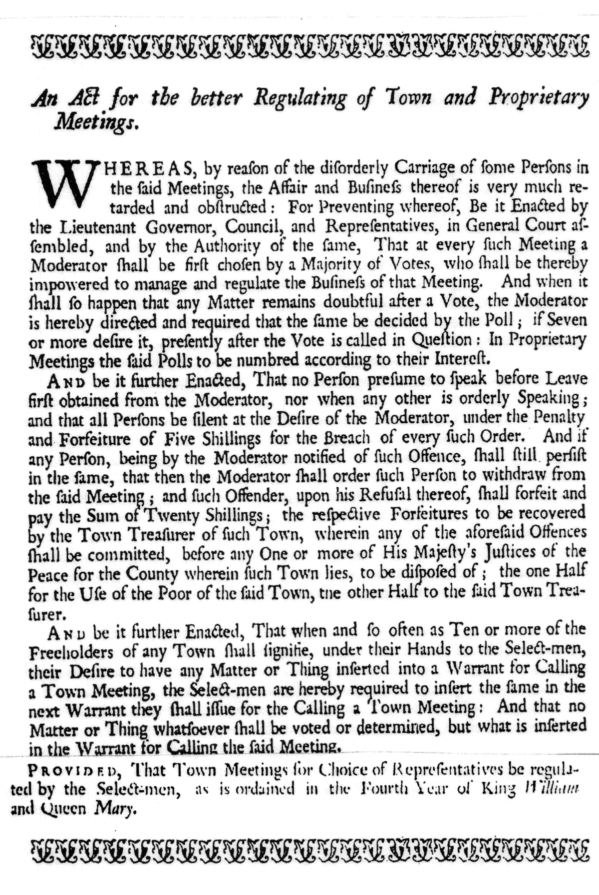 Town meeting has been a cardinal element of local government in New England about four hundred years. In Massachusetts they started in the early 1600s and were formally recognized until 1641. No doubt meetings were pretty rocky during the Puritan era. Things got so raucous that the Legislature finally had to impose rules governing all town meetings. This year is the 300th anniversary of a law that put in place some important rules which, with slight modifications, are still on the books.