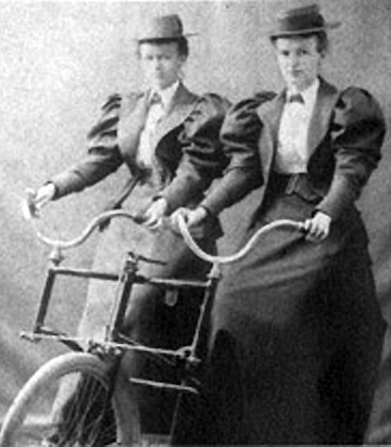 The photograph on the right shows sisters Flora and Susie Baker on a “Sociable”, a two-wheeled tandem bike with side-by-side seats and handlebars, convenient for courting (if you survived). The photo is courtesy of the Ipswich Historical Society
