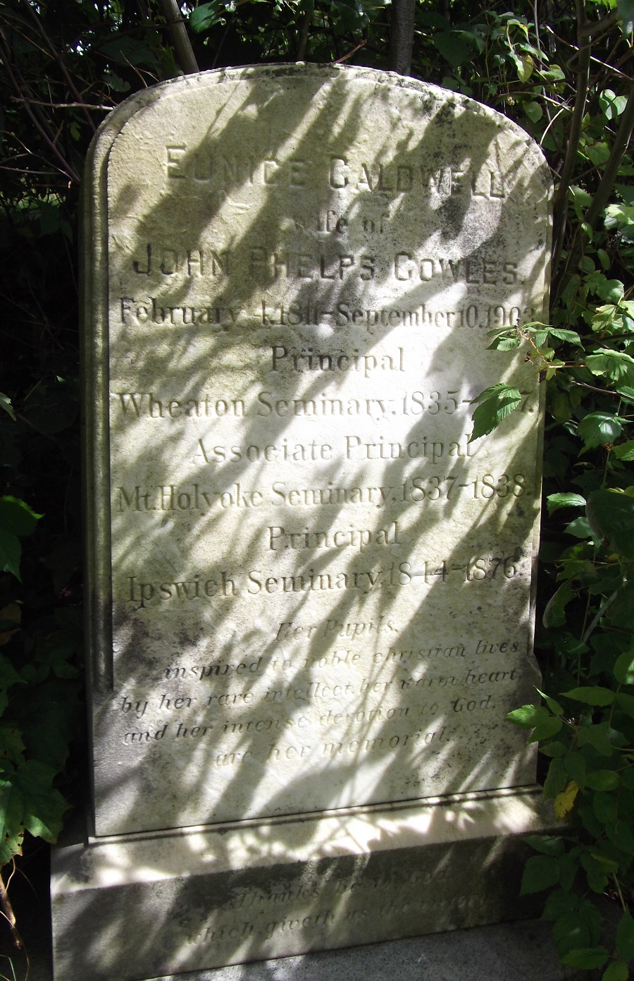 “Mrs. Eunice Caldwell Cowles, widow of Prof. John Phelps Cowles, died at her residence on Green Street today. She was born in this town on Feb. 4, 1811, her parents being Capt. John and Eunice (Stanwood) Caldwell. She graduated from the Ipswich Female Seminary in 1829; the Institution at that time being under the supervision of Miss Grant and Mary Lyon, whose names are familiar to every scholar. While a pupil her remarkable talents were recognized by her teachers, and soon after her graduation she was installed as a Teacher in the Ipswich Seminary.