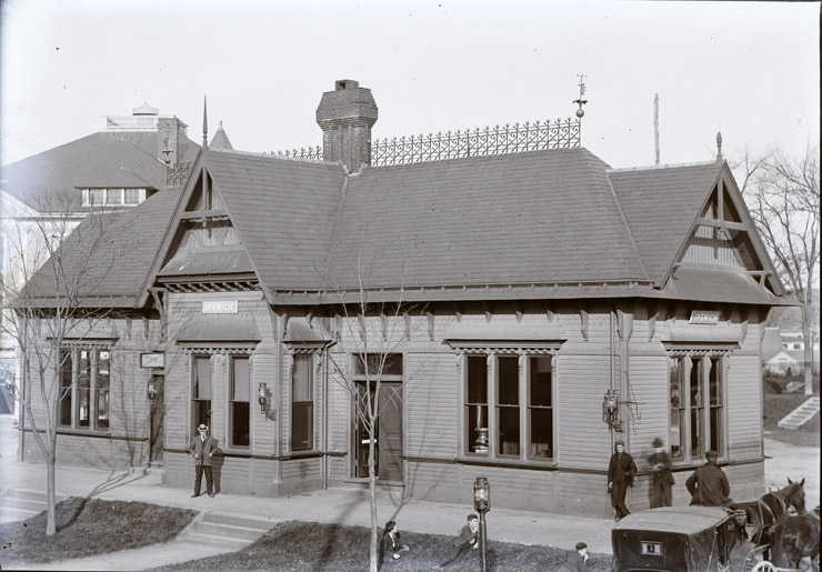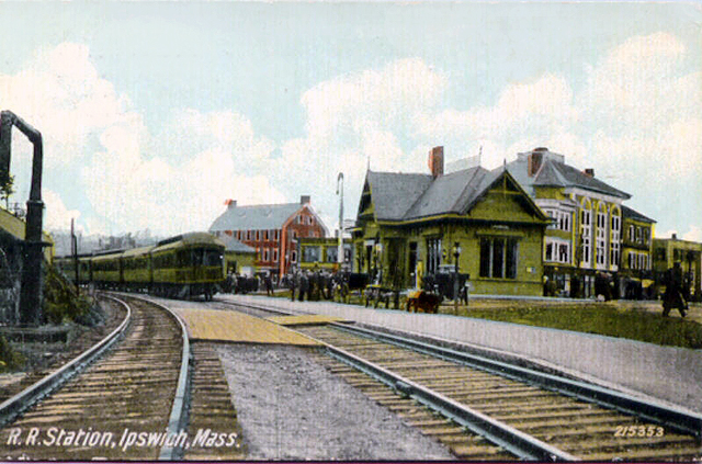 The Eastern Railroad ran from Boston to Portland, continuing to Canada and was the primary competition of the Boston and Maine Railroad until it was acquired by the B&M in the late 1880s to become the B&M’s Eastern Division. The Ipswich Depot sat at the location of the Institution for Savings at Depot Square.