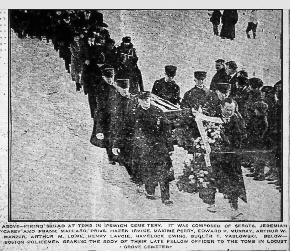 1. He was my uncle . My father ( John, his brother) was 6 when he was killed . Th Boston PD still sends a wreath to his grave every year on Memorial Day . When I was a Newburyport Police Officer in the 1970’s, I had the privilege of placing the wreath on his grave one year .