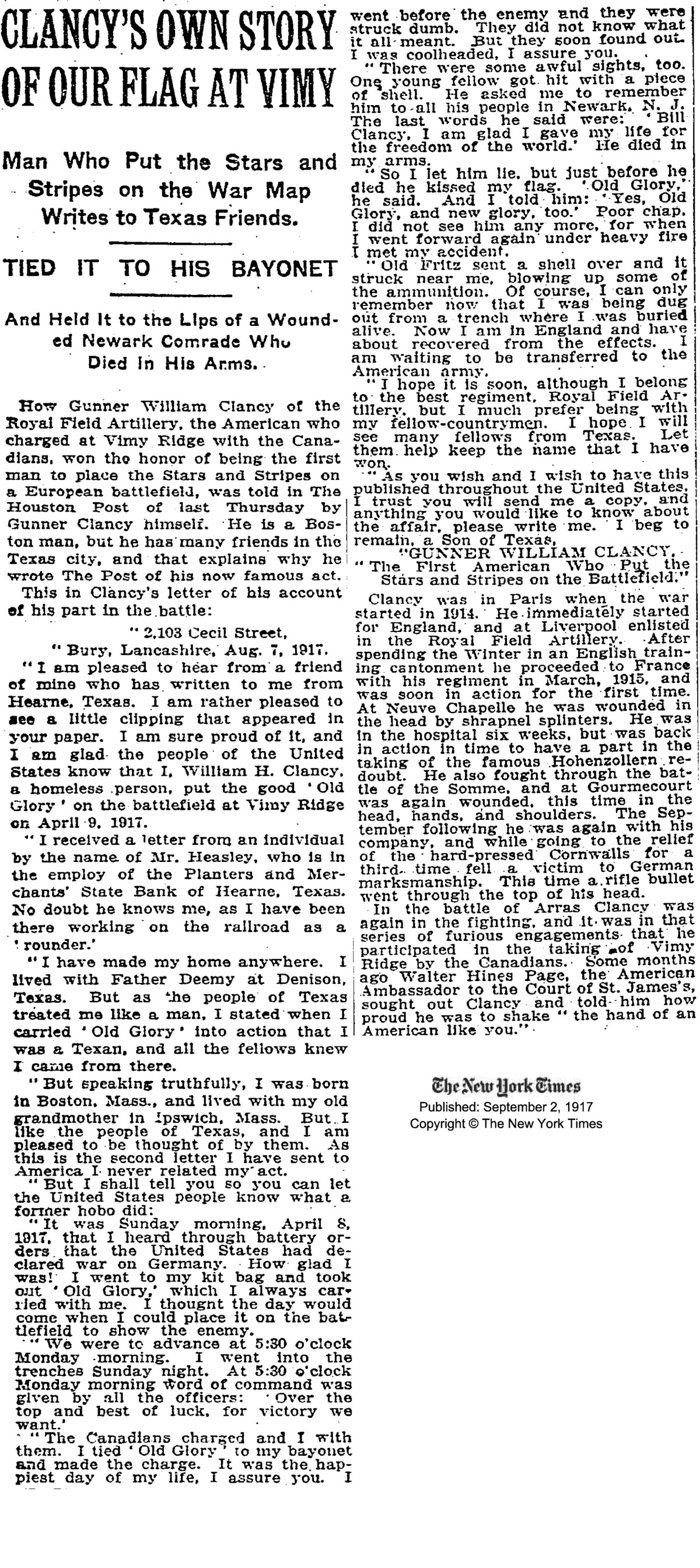On April 9, 1917, Easter Monday, in the battle of Arras, he went over the top at 5.45 a.m. at Vimy Ridge with a small American flag attached to his bayonet. On April 13, having secured their objective, the men dug in. A heavy German shell buried gunner Clancy under masses of earth, which crushed him painfully.