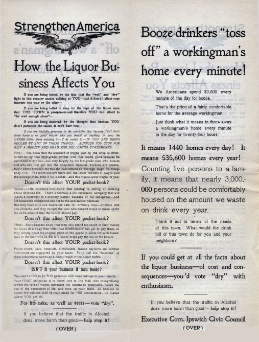 On January 17 1920, the Ipswich Chronicle published a small notice on the front page. A new law would be enforced by the Chief of Police; Prohibition was in. This new law, known as the Volstead Act, was promoted largely by the temperance leagues, in an effort to stop the marketing of liquor from salon trade and other public consumption. The manufacture, sale, and transportation of intoxicating beverages was prohibited. But that didn’t stop a few daring Ipswich men, out to make an extra buck.
