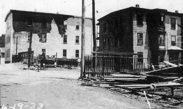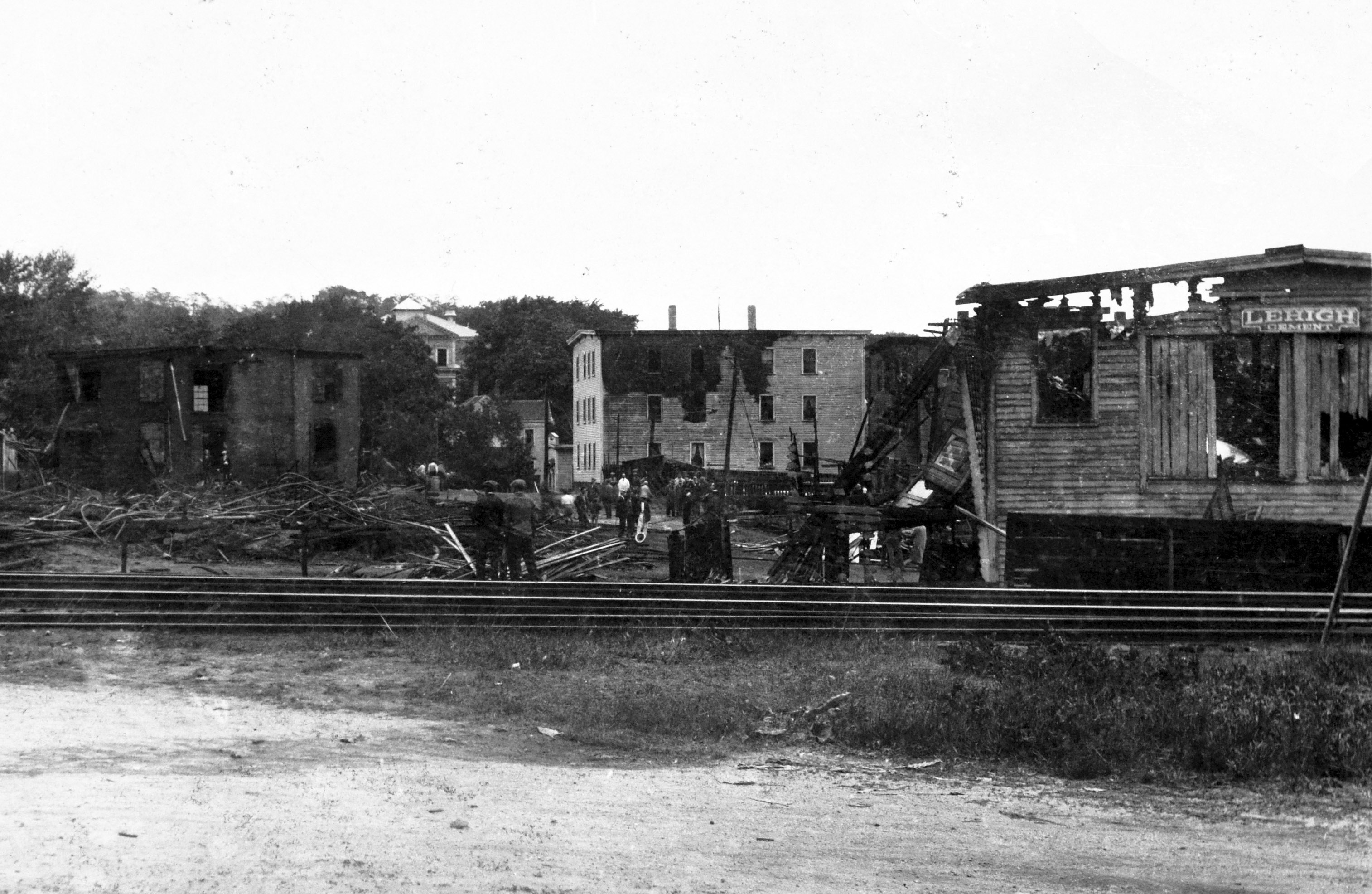 A view from Washington Street, across the tracks, from the Canney Lumber Company and the Burke Heel Factory after the fire in 1933.
