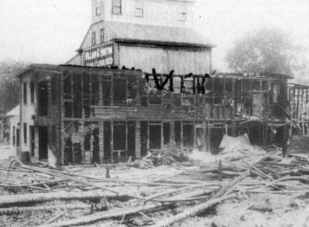 The Canney Lumber company next to Burke Heel Factory was completely destroyed. The Canney Lumber Company originally was located at the County Street bridge and manufactured wooden boxes. They operated a sawmill at the Brown Square location. You can see the old grain elevator now standing at Tedford’s, which bought the property after the fire. The grain elevator had originally been on the river close to the wharf, but was moved to this location.