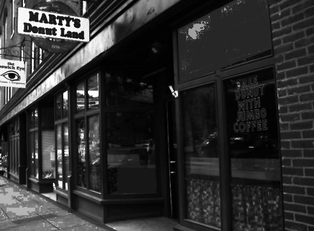 The venerable Ipswich House of Pizza is closed for the night. The fish market looks okay; the apartments upstairs are usually quiet in the night. Fabian Karol will be sitting on the steps out front by mid-morning. There’s another hour or so before Marty shows up at the donut shop. We check his place especially well. Marty’s is the lifeline for the night-shift worker. Super-hot coffee and day old donuts. By 4:00 a.m., the early birds will be perched on the stools along the counter. Nick Markos will pull up in his white van for a cup before heading off to his condiment business. Benny Colas will have a copy of the Boston Herald spread out, getting revved up for another long day at the Banana Plant on Mitchell Road. The morning crew from Soffron’s; Tim Player, Bucket Steen and Joey Jaslowich will shuffle in for caffeine and a brief conversation. But we’ll beat them all. Barring accidents, arrests or other Acts of God, the cops are here faithfully at 3:00 a.m. If Marty’s late, we just open up with our key and get the coffee started for him. Anyone who comes in knows to leave their money on the register.