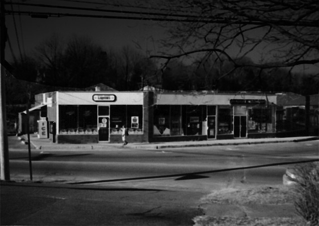 Further along, I light up the inside of Lou and Fran’s Luncheonette. The front window is partially obscured by fading yellow contact paper, but you can see the blackened grill and stained coffee urn, the lunch counter and booths. This place is a throwback to another era. Once commonly known as Beaver’s, a lot of the old timers still come here for coffee, chow and the pinochle game out back. Sgt. Frank Geist scoots down on his Moped every morning for breakfast before his day shift. These places are fading away now, and soon you won’t see the likes of them in town. There was a pool-room and barber shop on the second floor. One night I saw the upstairs window open, so I climbed the fire escape to have a look-see. Old slate pool tables, cue racks, barber chairs encased in a layer of decades-old dust. Ghostly relics of a simpler, less complicated world.