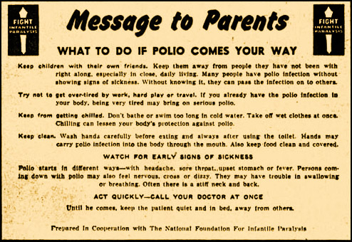 I grew up in Ipswich in a day when save for diphtheria, there were literally no inoculations for childhood diseases. There was no going to your Ipswich family doctor to receive a shot or vaccine to keep you from getting measles or mumps. No, the only real method for becoming immune to any of the common childhood diseases was simply to contract it, and during a several-year period, I managed to contract them all: whooping cough, mumps, scarlet fever, measles, chicken pox. In fact, it was not unusual for parents to intentionally expose their children to someone with one of the milder contagious diseases and when I came down with chicken pox two kids from next door were sent over to play with me. But while this was the case for many childhood diseases there was one that everyone feared and no one wanted to contract: polio.