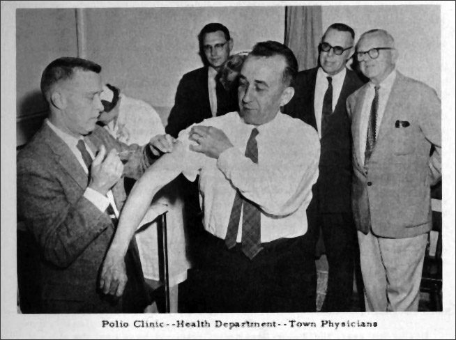 One of the most outstanding programs of 1956 has been the administration of the polio vaccine. A total of twelve clinics were conducted during the year with 2140 adults and children attending. All inoculations at the public clinics were given by Dr. Frank Collins, who was assisted by school nurse Violet Demille, Mrs. Ira Brainard, Mrs. Patrick Donovan, and former school nurse Eleanor Richardson.