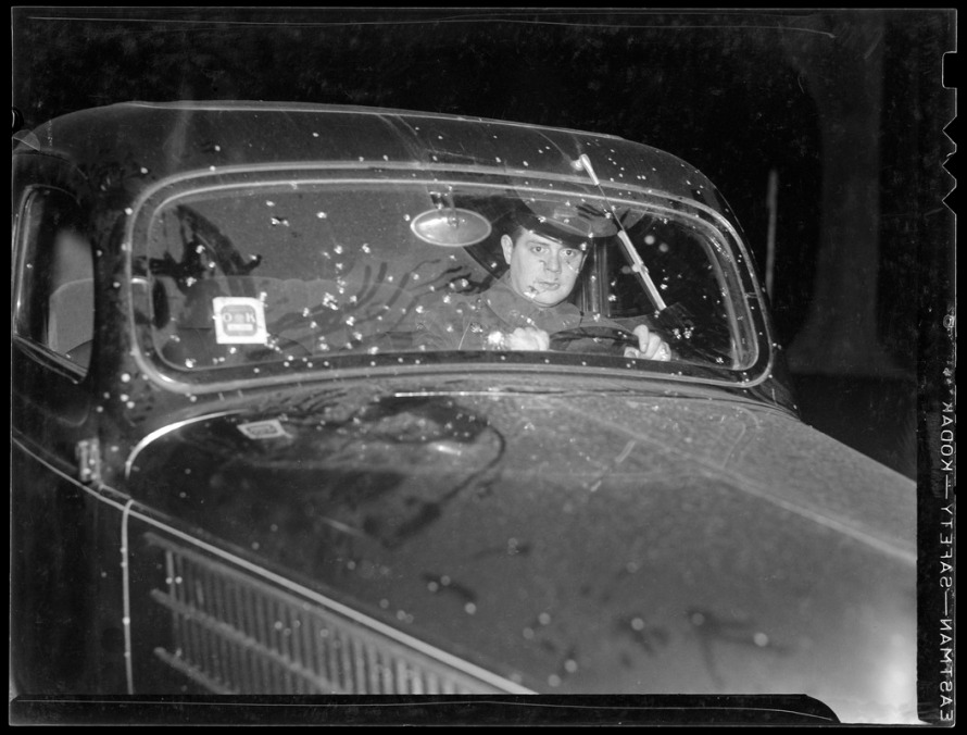 Life in the fast lane – Trooper Frank Geist Sr. after pursuit on the Concord Turnpike – His cruiser was riddled by a shotgun blast during a chase – April 16, 1937 (Courtesy of M.S.P. Lt. Col. Ronald Guilmette Ret.)