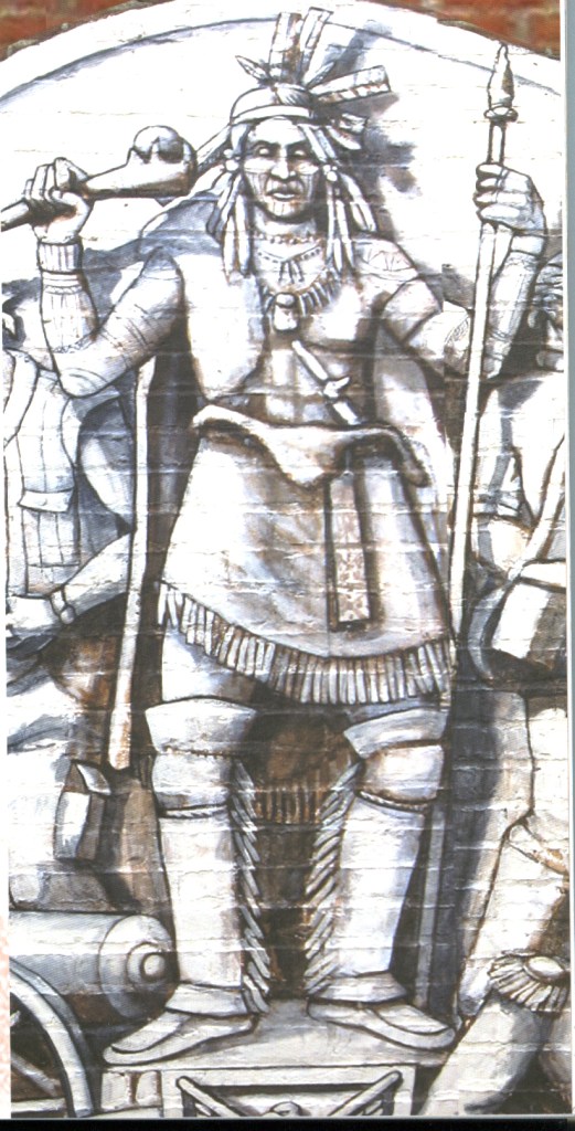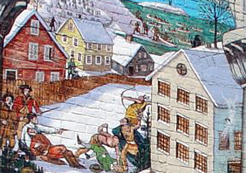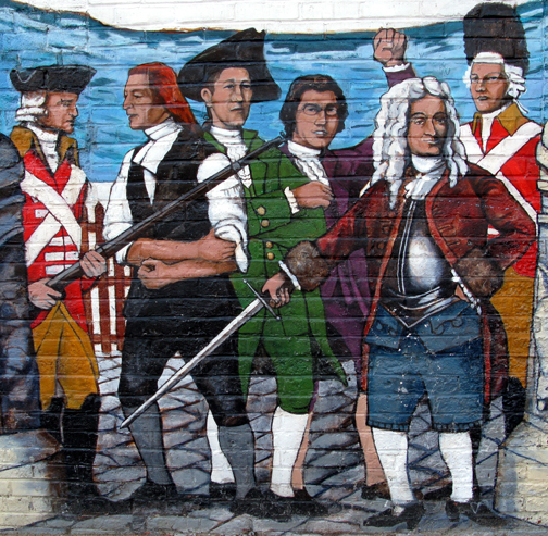 The long struggle between France and England between 1689 – 1763 is called the French and Indian Wars. Local native Americans fought alongside Ipswich residents, while the French were able to draw on help from the Abenaki and other tribes hostile to the Massachusetts Confederation. In the foreground are soldiers crossing the Choate Bridge led by Col. Benedict Arnold on their way to attack Montreal in 1775. A young Aaron Burr was among the ranks, along with several Ipswich men.