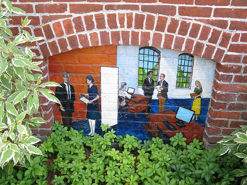 This plaque on the parking lot side of EBSCO Publishing gives credit for the mural to artist Alan Pearsall, EBSCO Publishing, the Ipswich Historical Society, and the Ipswich Public Library, as well as Alan’s assistants and the many local people who modeled for the mural.