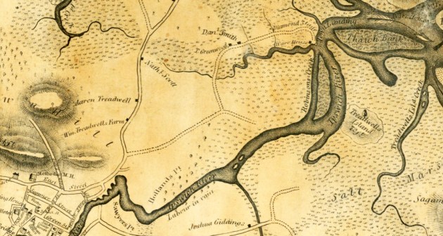 About a mile and a half heading out along the Ipswich River, Mr. Diamond set up a fishing stage, a platform on which fish are landed and processed for salting and shipping, and became quite successful and respectable. A road was built through the marsh to the stage, following today’s Newmarch Street and Arrowhead Trail. Fishing became a successful early industry, and wharves were built on the Necks and at Diamond Stage in the 17th and 18th Century.