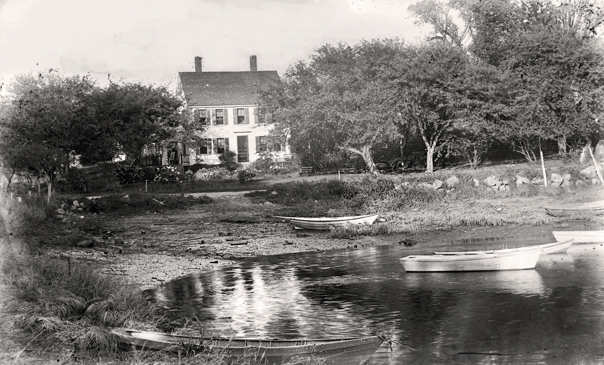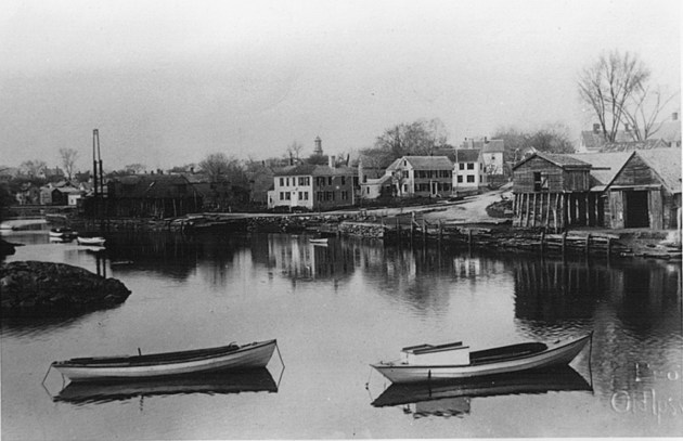 The small building in the foreground could be the old Ipswich Custom House. That office was discontinued in the 1870s when the records were moved to Newburyport and subsequently lost. By the time the picture was taken, it could either be an office or a snug one-room home complete with roses climbing up a tiny trellis and sporting some rather fancy Victorian trim. Later the small building would be moved down to Brown’s Square, where it still stands as part of an office for a commercial enterprise. In the center of the picture is the ever-present “Ringbolt Rock.” This ancient guardian of the tiny harbor was so named because of the giant iron rings that somehow or other were fastened to its slippery surface and helped pull the boats around the point when the going got sticky. Similar iron rings dotted Nabby’s Point and other spots along the river and remained in place until gathered up in the great scrap metal drives of World War II.