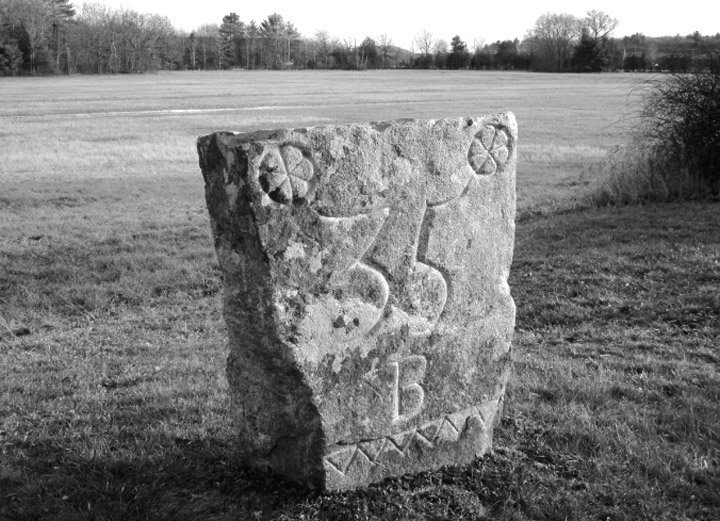 The next stone, marked 35 B, stands at the corner of Middle Road and Boston Street. One stone near Four Rock Bridge is inscribed 3613, and at the corner of Green and Hanover Streets the last marker gives the distance to Boston, B37, on its face and on opposite ends the distance to Portsmouth, P28, and to Ipswich, I10. The milestones are for the most part rough fieldstone, thought to be diorite, with crudely carved letters and ciphers. Newbury’s stones are adorned with symbols such as triangles, whirls, and crossed circles whose meanings have been the subject of some study.