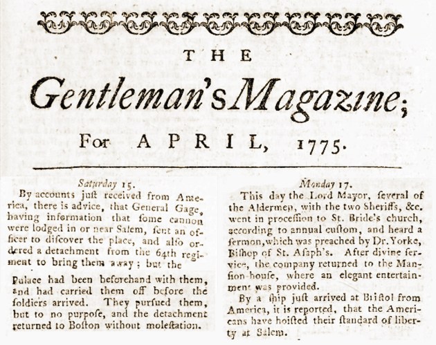 On April 18, 1775, General Gage sent 700 British soldiers 18 miles to Concord and ordered Lt. Colonel Smith to take control of the two bridges in that town, the South Bridge and the North Bridge. The rest is well-known history, but news of these events took time to cross the Atlantic. Just the day before, on April 17, The Gentleman’s Magazine of London published the following announcement: By a ship just arrived at Bristol from America, it is reported that the Americans have hoisted their standard of liberty at Salem.