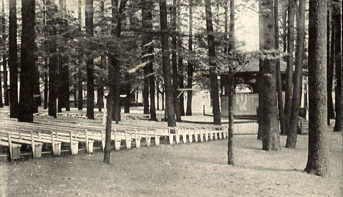 12,000 people, most from Boston, attended the first camp meeting in 1859. A pulpit and wooden benches were erected in a pine grove and guests slept in large tents on platforms. These gave way to over 300 cottages constructed by the beginning of the 20th Century. The site included a chapel, library, dining hall, hotel, bakery, post office and even its own jail.