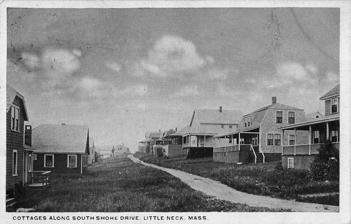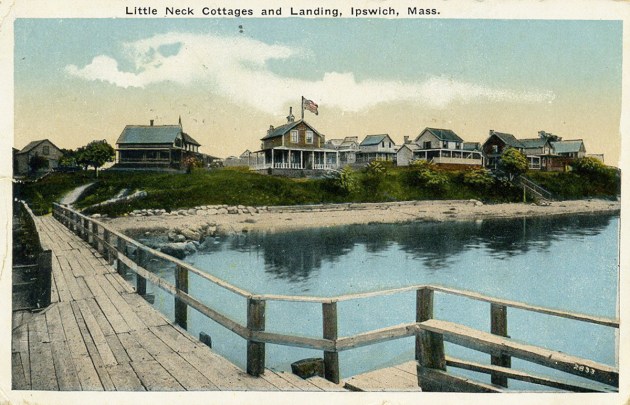 For over 250 years, except for a few tents and cottages along the Ipswich River shore which were used by fishermen and campers, the land was used as a pasturage. In the early 1900s, the building of a few modest cottages began. In the 1920s, this building was greatly accelerated until now the ‘Little Neck Estates’ comprise nearly 200 modern cottages.”
