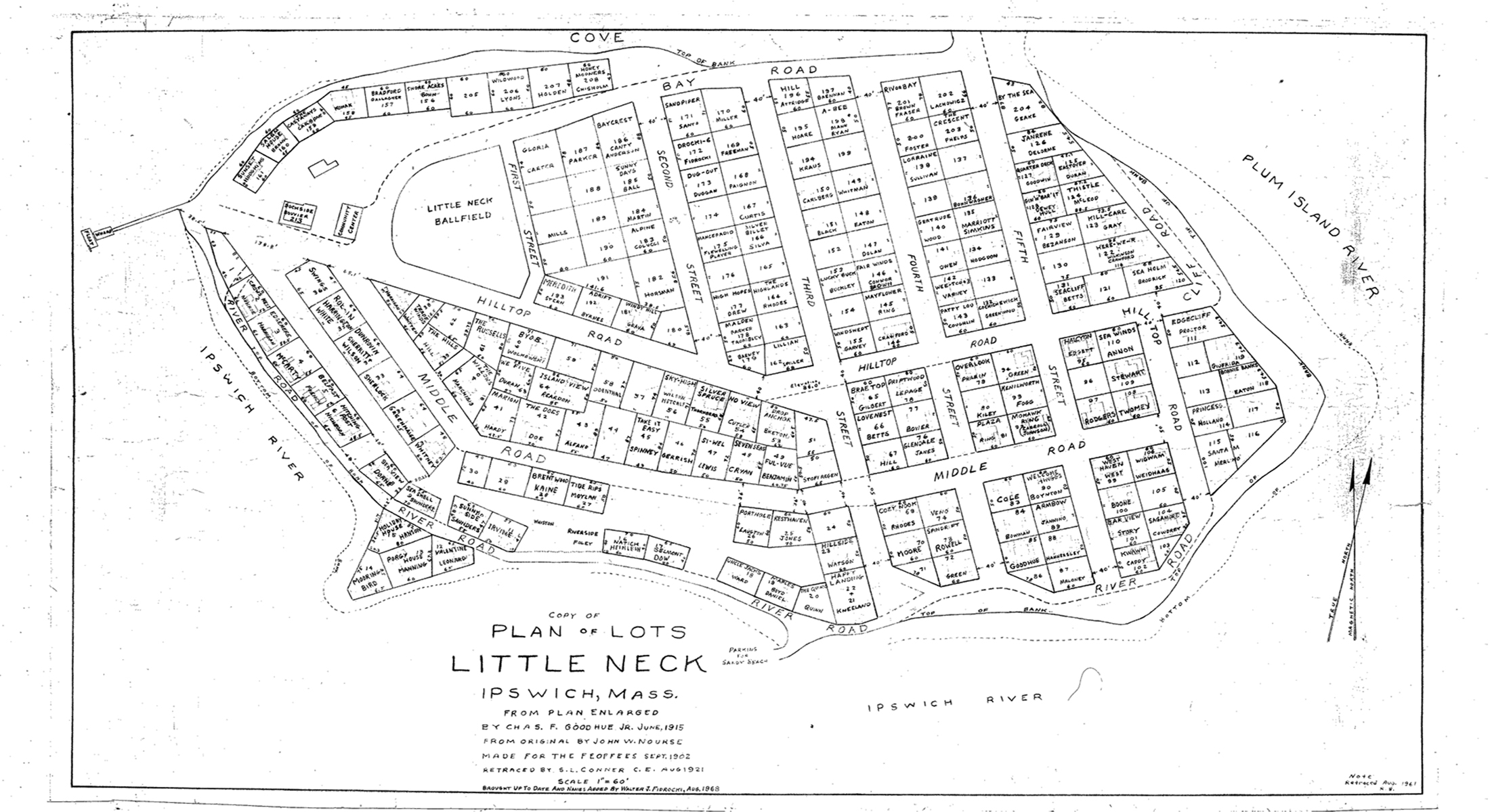 In 1902, John W. Nourse drew up a plan of Little Neck for the Feoffees. That plan showed a total of 161 lots and 72 cottages mostly along the river and on the lower part of Middle Road. There were also five facing the cove. In June of 1915, the Nourse plan was redrawn and updated by Charles F. Goodhue, Jr. who at that time was a college student. Extra 50 by 60 foot lots were added by extending Second, Third, Fourth, and Fifth streets from Hilltop Road down the hill to Bay Road for a total of 204 lots and another 38 cottages were added making a total of 110. Both plans showed the former hotel where the community center is today and the old firehouse at the top of Hilltop Road. None of the streets were named on either plan.