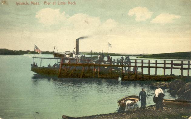 Early summer residents at Little Neck came to Ipswich by streetcar or by train, walked to the town wharf, then climbed aboard the Carlotta for the final lap of their journey. That steamboat operated for more than a quarter of a century from May until September. Each day it left the wharf at 9:00 a.m. and 1:30 p.m., went to the Neck, Ipswich Bluffs, Grape Island, and Old Town near the Parker River bridge, and returned.