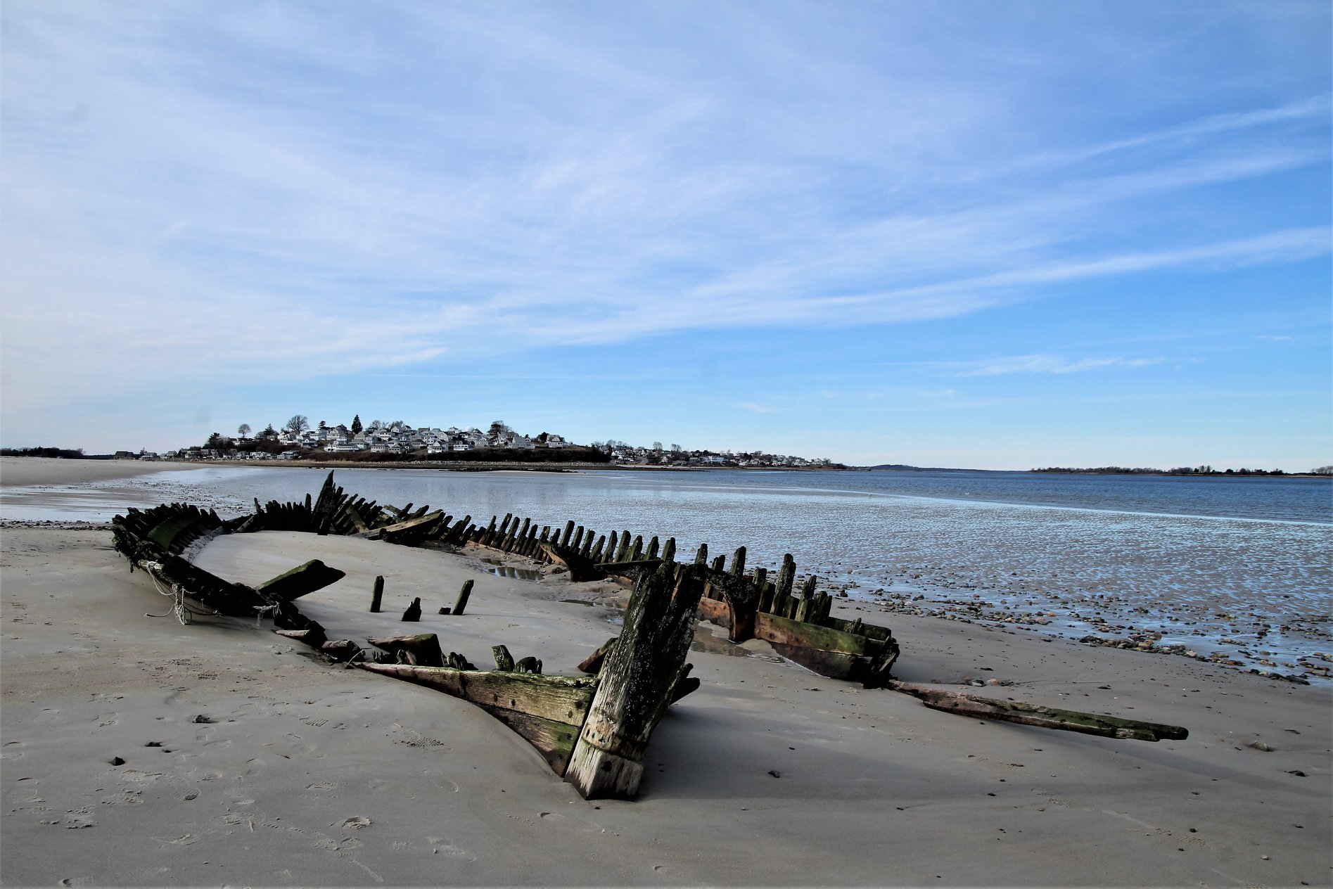 Wreck of the Ada K. Damon on Steep Hill Beach, with Little Neck in the distance.