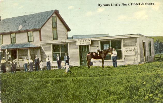 The early postcard shown above is the Little Neck Hotel circa 1915. The sign on the back wall c the open porch reads “Welcome Hotel – 11888 Greenheads.” Some things never change! The other sign over the one-story building to the right reads “Little Neck Hotel.” There is no mention of a store on either of those signs.