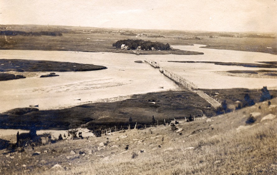 “In 1886, a road was constructed from the mainland to Hog Island by Captain Lamont G. Burnham for the proprietors, Messrs. Marshall Choate and himself. The road across the marsh, about one-half mile long, from Low’s to Dean’s Island was located and built a few years previously for his own use by Rufus Choate, who also built a small ferry boat upon which he could drive a horse and light carriage and by the use of ropes and pulleys could cross at any time of the tide.