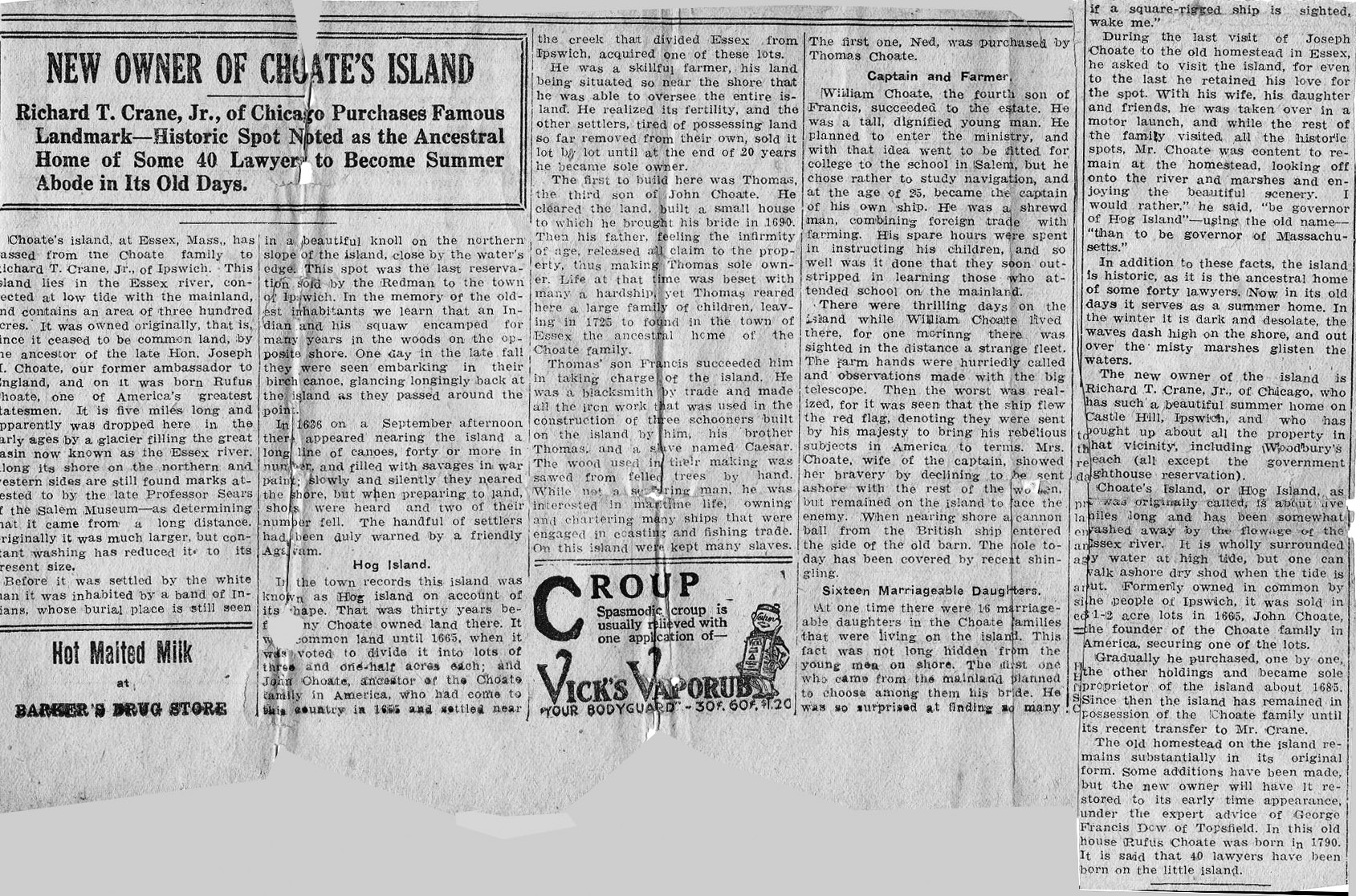 I would add that there is an important history of slavery attached to this island and family. There was an active shipyard here and it employed slaves. Caesar is identified as one. I believe his name appears in the Choate family history.