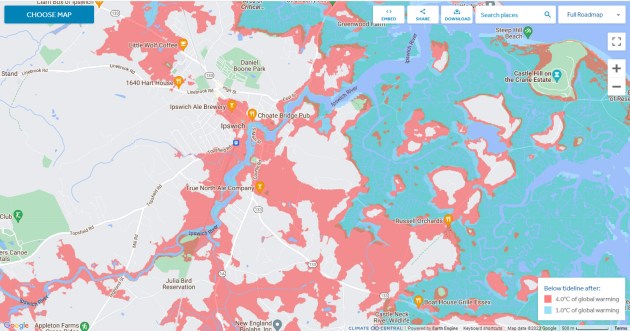 Sea levels rose about 8 inches globally and about 1 foot on the Eastern Seaboard in the past century. What would happen to Ipswich if catastrophic predictions for the 21st Century are realized?