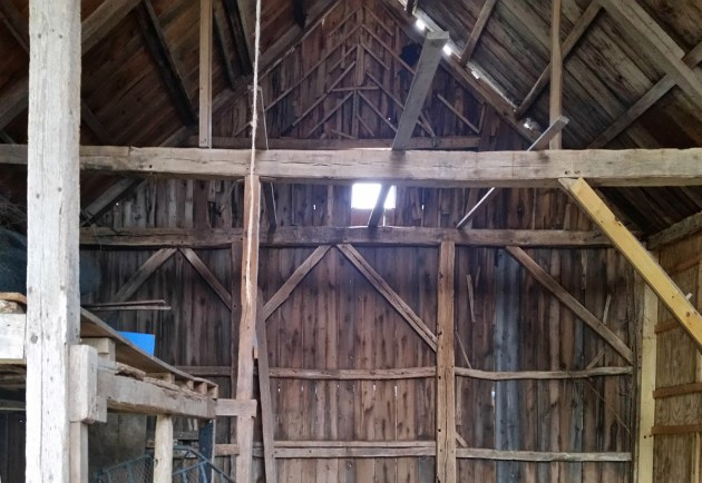 In some barns, including this one, raking (angled) struts perform as a wind-brace and help prevent the principal rafter from bowing under snow load. In England, this form of barn roofing is found in barns constructed as early as the 16th Century.
