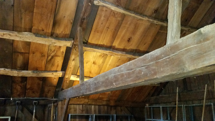 In some barns, including this one, raking (angled) struts perform as a wind-brace and help prevent the principal rafter from bowing under snow load. In England, this form of barn roofing is found in barns constructed as early as the 16th Century.