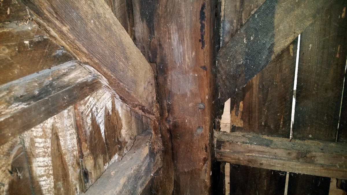 Wind-braces in each corner of this building are mortise and tenon, secured with wood “tree nails.” This form of bracing is found in the Fairbanks house in Dedham MA, the oldest house in New England, and has been observed in early 18th Century houses in Ipswich.