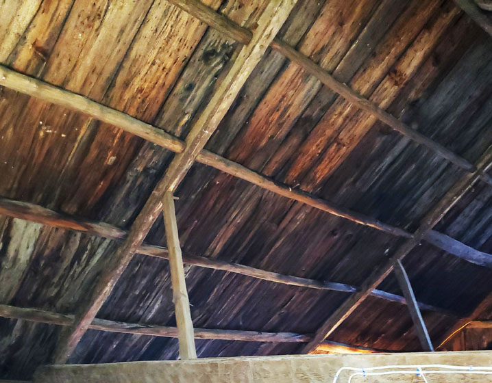 The “principle rafter and common purlin” roofing system in this barn is a form believed to have been invented in the Massachusetts Bay Colony and is unique to the English colonies in Eastern New England, persisting into the first quarter of the 19th Century. Purlins are supported by massive widely-spaced rafters and carry the vertical roof sheathing.