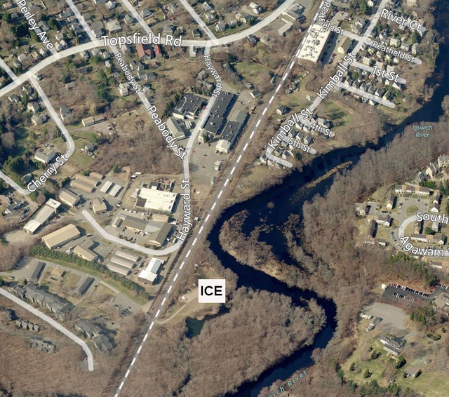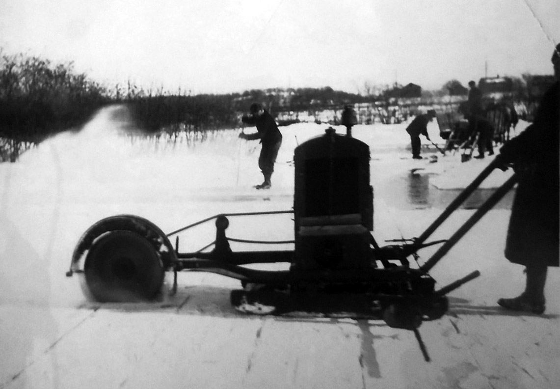 Susan Howard Boice wrote that it took three railroad cars full of lumber to build the ice house. The inclines on the outside of the building were used to haul ice up the levels. Ice was harvested on the Ipswich River between Upper River Road and Hayward Street. Lines were drawn on the ice and horses dragged “groovers” along the line, cutting the ice about 6 to 8 inches deep. was cut into rectangular blocks. The ice was then floated to the ice house, where it was cut into 22″ blocks using a sharp needle bar. Horses or motors moved the ice up inclined ramps, where metal bars along the inclines shaved the blocks to a uniform size. By 1940, the popularity of artificial refrigeration ended the need for harvesting ice.
