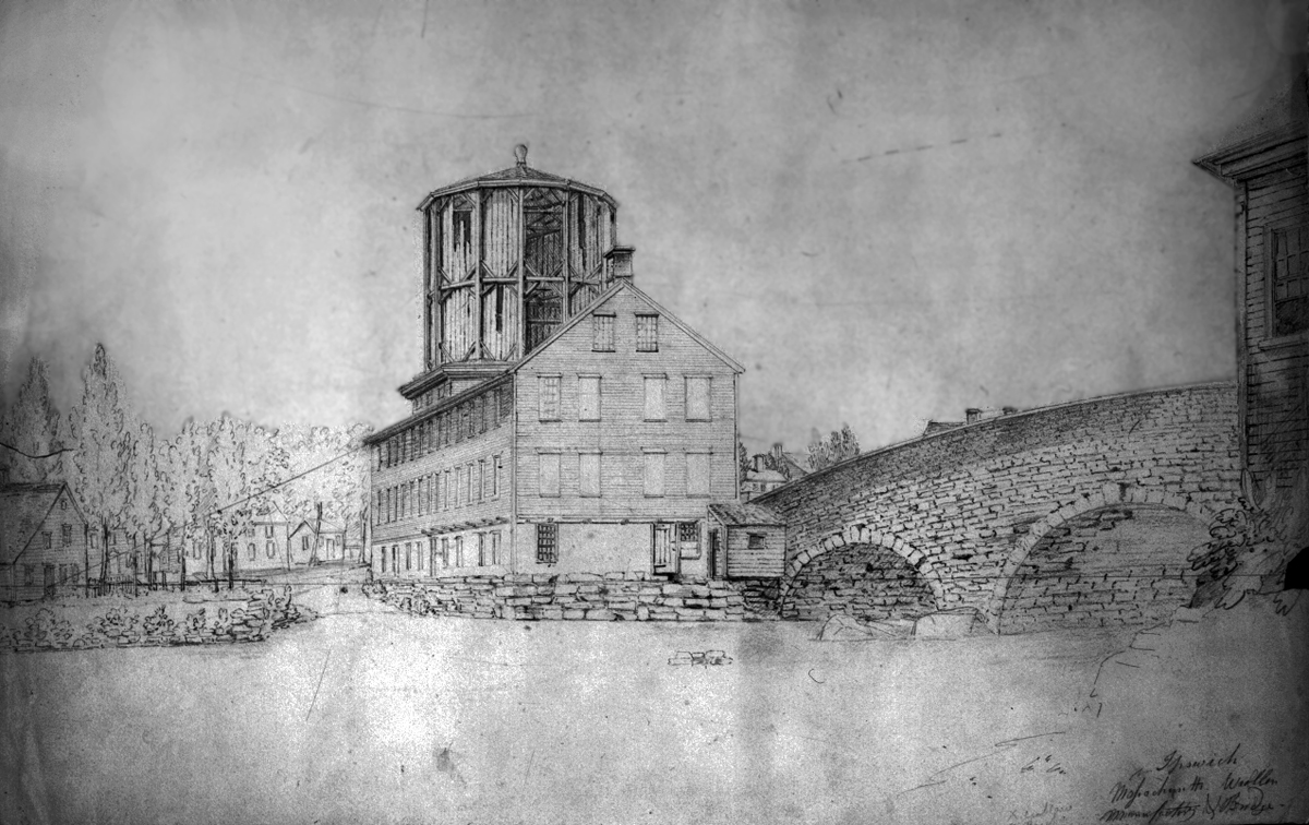 The first windmill in Ipswich was erected at “Windmill Hill” (the site of the former Cable Hospital). It disappeared by the end of the 17th Century. In 1792 the town of Ipswich granted land at the corner of Market Street and South Main Street to Dr. Manning as the site for a woolen mill. The building was one hundred and five feet long thirty-two feet wide and two stories high. On the roof over the center of the building was an octagonal tower to sustain the arms and sails of a windmill by which it was proposed to operate the machinery. The venture was short-lived, and by 1800 all operations ceased.