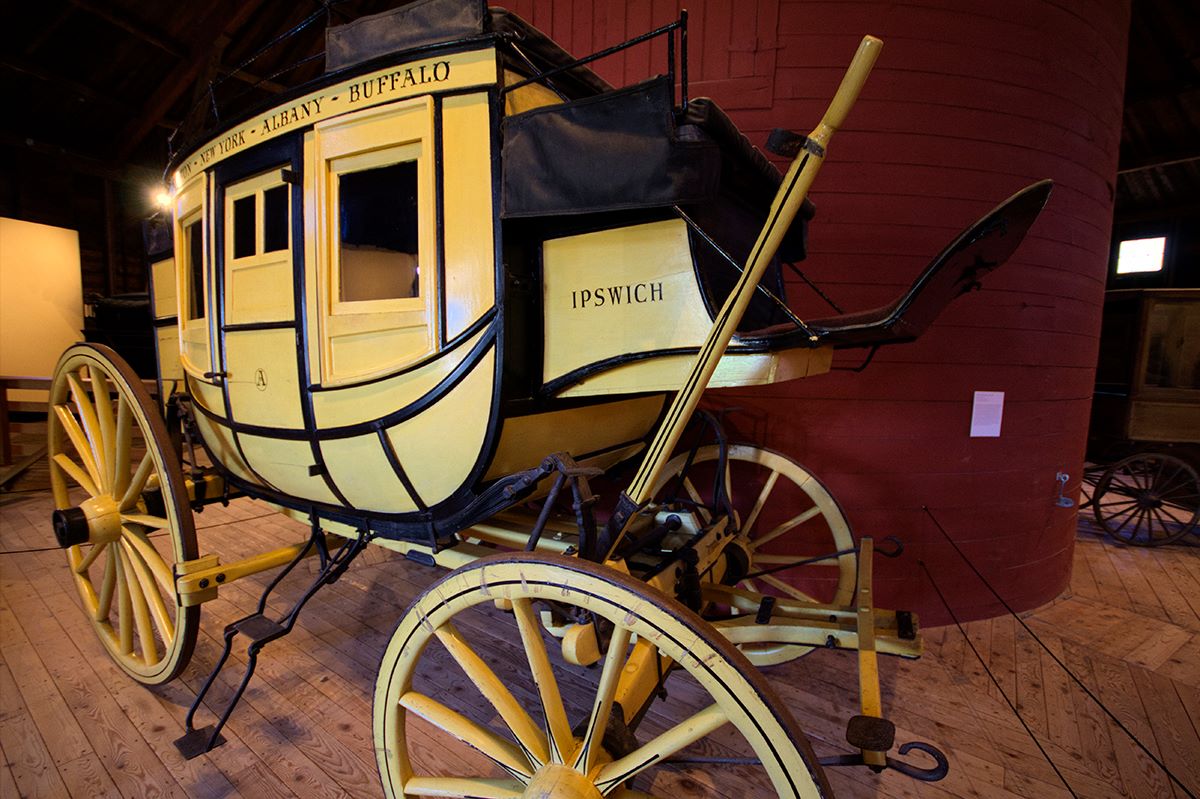 The Concord “Ipswich” coach at the Shelburne Museum was given to the museum by Joan Appleton, of Appleton Farms, Ipswich. The family monogram – an “A” in a circle – is painted on the door. I have some old photos of Appleton family members on this coach.