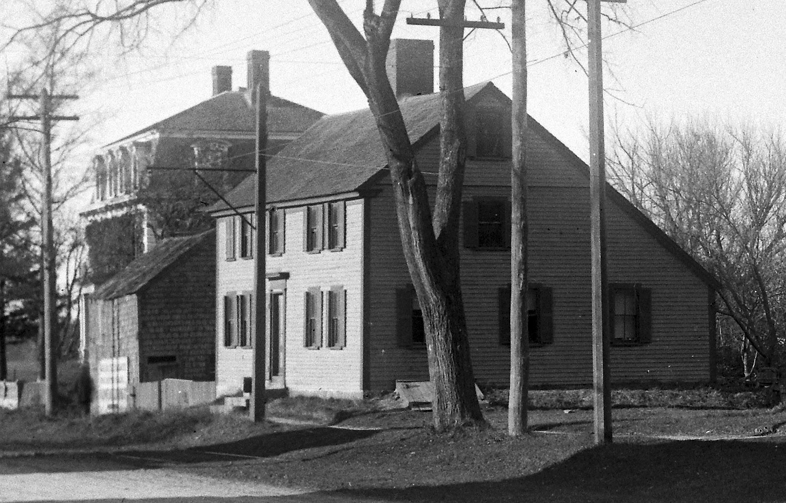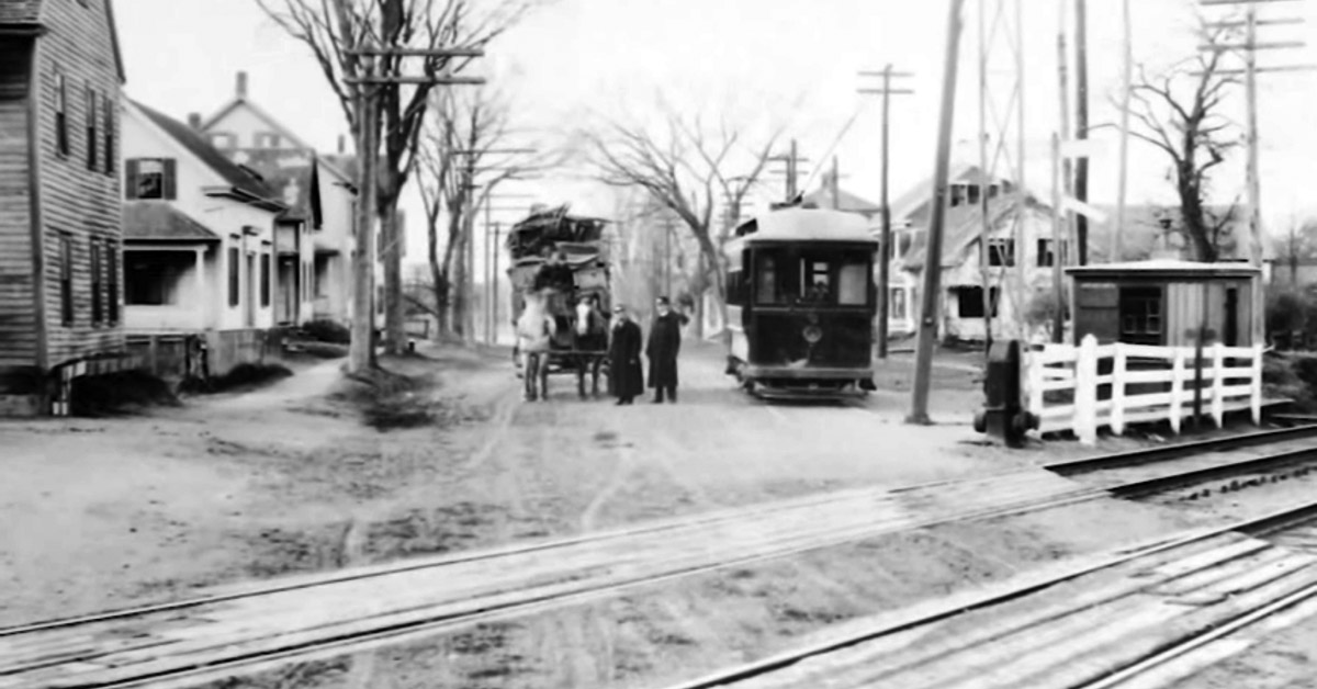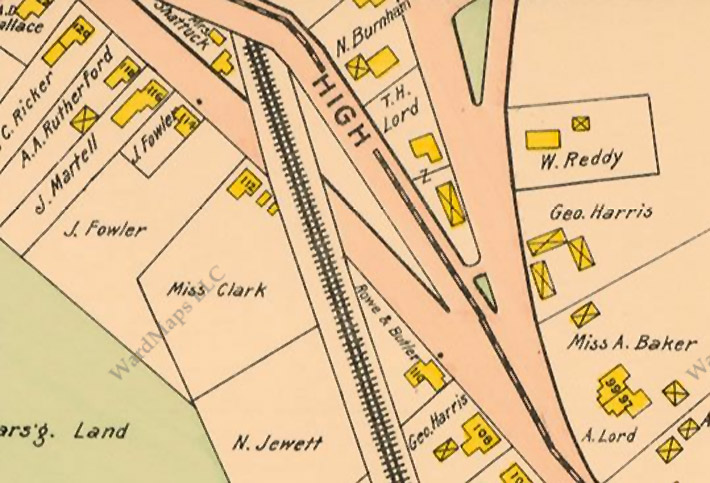 High Street originally continued straight at 110 High Street past the John Kimball Jr. house with the blue tree house, until the first bridge over the railroad tracks was constructed in 1906. From 1896, when the first trolleys came to town until the bridge was built ten years later, passengers had to unload there to switch from the Georgetown trolley to continue on the Ipswich-Essex trolley.