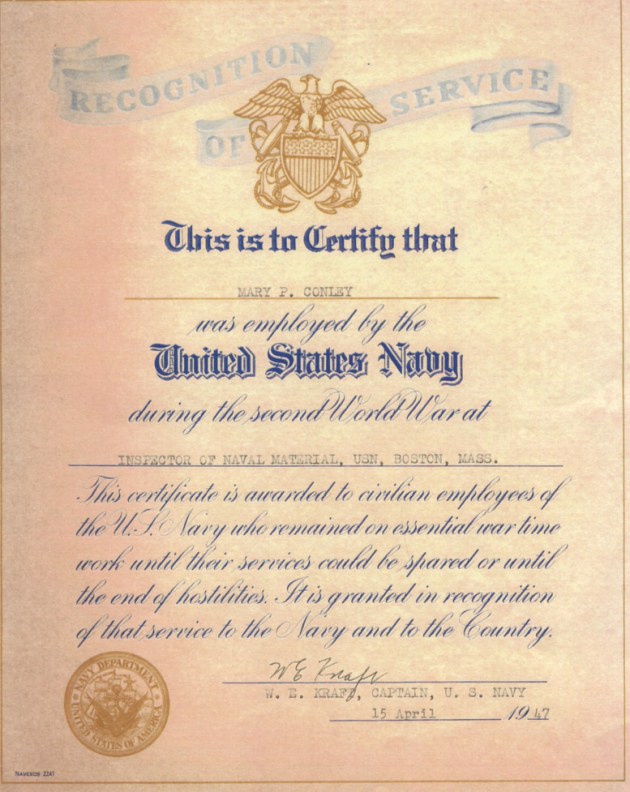 Looking through my mother’s papers, I find a card that originally held a pin. The card is from the Bureau of Ordinance, U. S. Navy which extends congratulations, and an “E” insignia to the men and women who participated in the production of the proximity fuze. It seems this card originally held an Army-Navy E insignia. Anyone else who’s mother worked on the proximity fuze find information about the company getting the Army-Navy E emblem, and our mothers receiving “E” insignias?