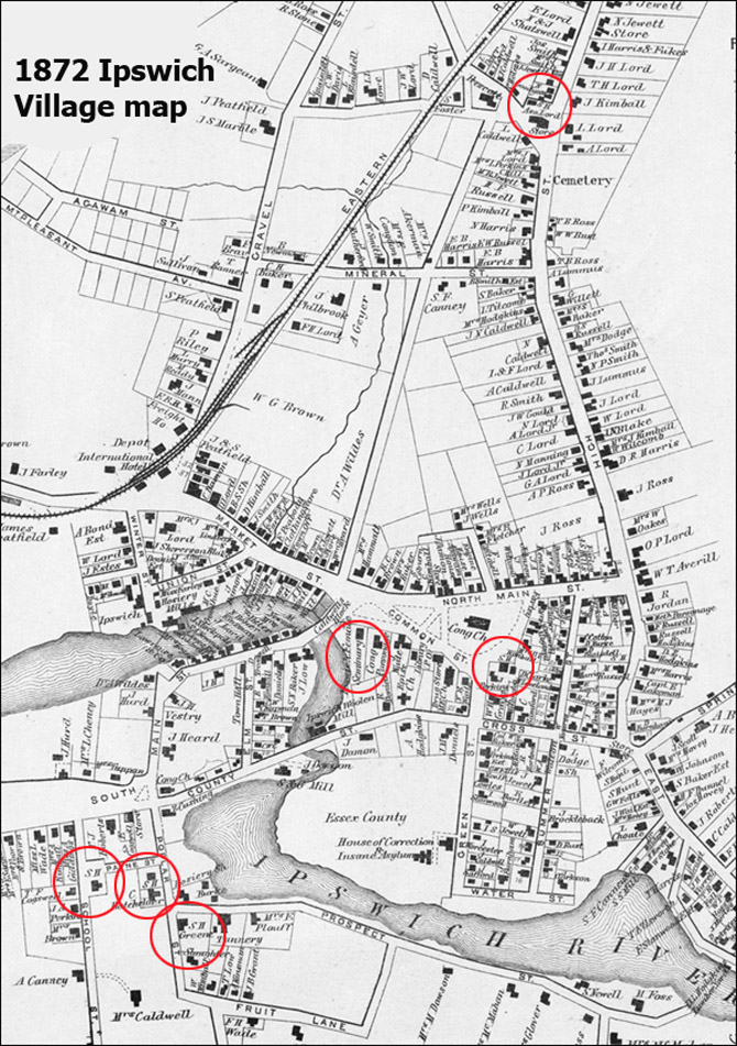 The 1872 Village map has the public schools marked simply SH (circled in red). The Town House has been moved to Depot Square by Mr. Damo. The Dennison School is still at Meeting House Green, and there are now three separate schoolhouses near the South Green (School House Green). The Payne School at Lords Square has not yet been moved to its current location. The Ipswich Female Academy is still operating. Central Street has been created, but the Manning and Winthrop Schools do not yet exist.