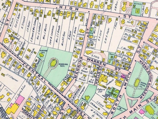 The locations of Winthrop and Manning Schools are shown in this close-up from the 1910 Ipswich town map